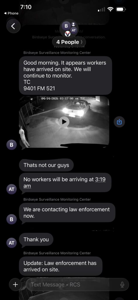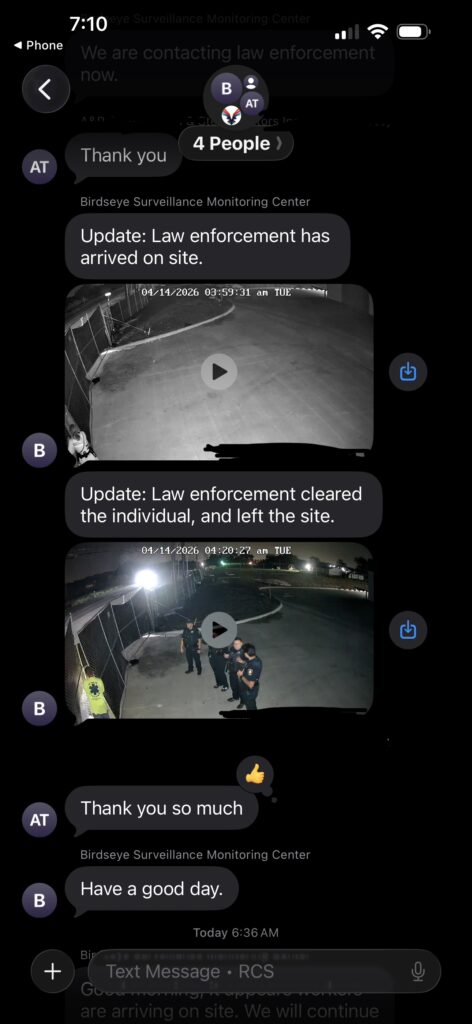 At Birdseye Surveillance, our mission is simple: give you complete visibility and control over your job site—without adding extra work to your day. One of the most powerful ways we deliver on that promise is through personalized, real-time text message alerts directly from our live monitoring center to your phone.