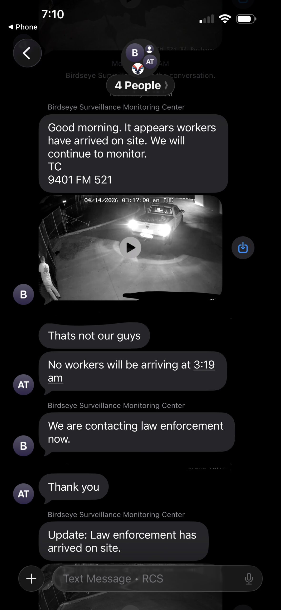 - 3:17 AM: Our monitoring center detects activity and immediately notifies the client: “Workers have arrived on site. We will continue to monitor.”
